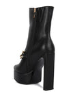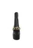High Block heeled square toe boots with chunky metal chain deets look all gorg! The high platform adds to the height. Has a side zipper for closure.