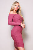 Center back ruching detail. Mini length. Medium stretch for comfort