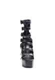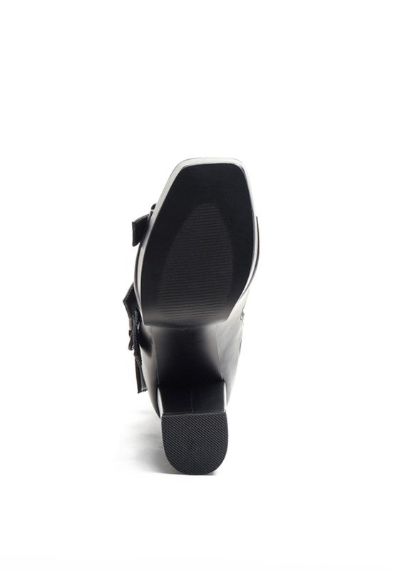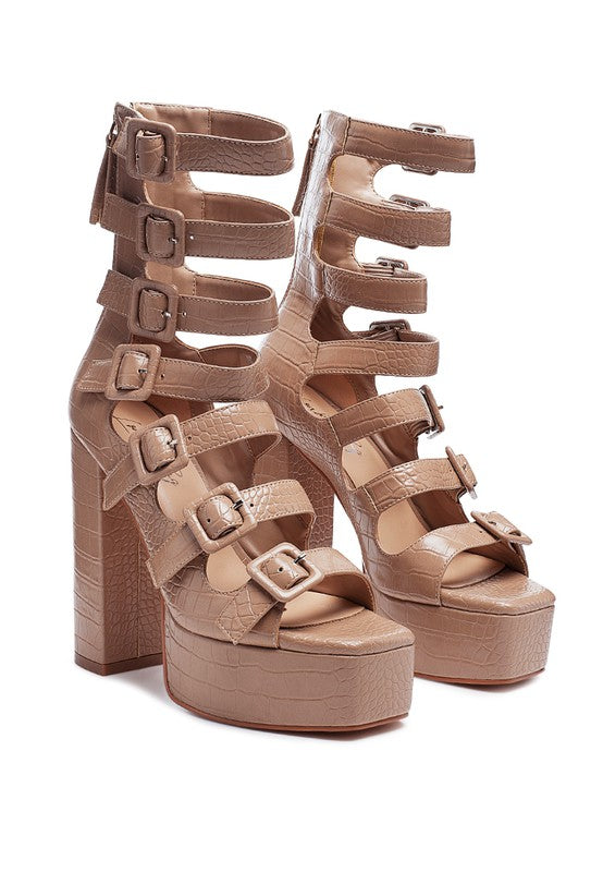 Quite a show - this pair of buckle lined sandal gives caged look and high block heels give the oomph. The square cut toe beauty if for keeps throughout all the events and casual occasions. Is easy to wear with back zipper opening.
