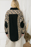 Oversized, reversed stitched mixed media shacket with elbow patch and front pockets.