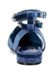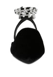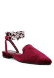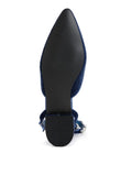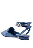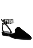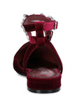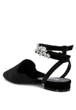 Pointed toe flat mules handcrafted in fine cut pile velvet has rhinestone - diamante detail on ankle strap. The ankle strap has pin buckle fastening wo keep the flats secured. Comes with lightly padded insole.