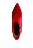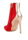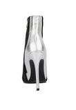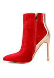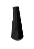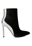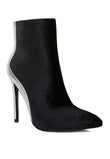 Chase wild highs in these high heel stiletto boots in velvet. The black velvet looks gorgeous with silver metallic panel. It has side zipper opening which makes it easy to put on. The closed pointed toe ankle bootie is perfect to make any winter look gorg!