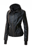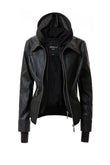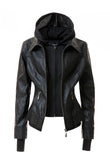 Women's Casual Stand Collar Detachable Hood PU Leather Jacket